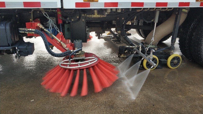 ![]() | 駕駛室后下方標配低壓前沖,由低壓水泵 產生的水流,可以像灑水車一樣對路面進行大 面積沖洗,沖洗寬度可達16米。 |