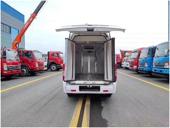 二、廂體配置:采用我公司液壓吸附一體成型生產線制造,保溫性能達到****標準,單排廂體內部尺寸為:3030*1615*1500(mm)容積為5.6立方,廂體內外面料采用**新款納米玻璃鋼(不吸光、隔熱性好、硬度強、抗氧化),廂體厚度為8cm,內襯骨架為防銹處理武鋼優質輕鋼型材,保溫材料為無空隙填充聚氨酯發泡,廂體底部為鋁合金花紋板或選平面納米玻璃鋼,廂體采用鍍鋅不銹鋼包角,加厚型鋁合金包邊,后門框為不銹鋼,加厚型不銹鋼后門合頁及鎖件,廂體內部采用LED照明燈及廂體示寬燈。