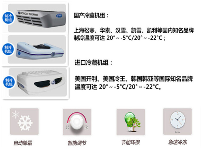 三、選裝冷機:可根據客戶的用車需求選擇不同的機組,客戶可選-5℃、-10℃、-15℃、-18**-20℃冷藏機組 ,冷藏機組品牌有國產勁達K牌、韓亞、漢雪、華泰、松寒、凱雪、超酷..等冷藏機組,進口冷藏機組品牌有:美國開利、美國冷**。冷藏機組分為**機組和分體機組!根據您的用車需求推薦合適的冷藏機組! 該車型可選裝“制冷+加熱”雙溫機組(**溫度范圍為+20℃**-18℃)可用于東北地區及內蒙 ** **等嚴寒地區!